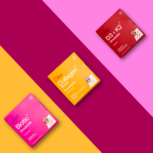D3 + K2 rafforza le ossa, Collagen migliora l’elasticità della pelle, Biotic riequilibra la flora intestinale e potenzia l’assorbimento dei nutrienti.