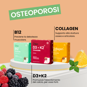 Un supporto completo per la salute delle ossa e delle articolazioni. Il pacchetto combina D3+K2, Collagen e Vitamina B12 per favorire l’assorbimento del calcio, migliorare la flessibilità articolare e sostenere la funzione muscolare. Ideale in menopausa o per chi desidera prevenire fragilità e perdita di densità ossea.